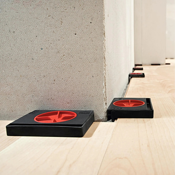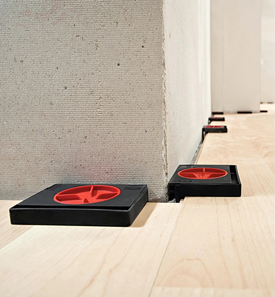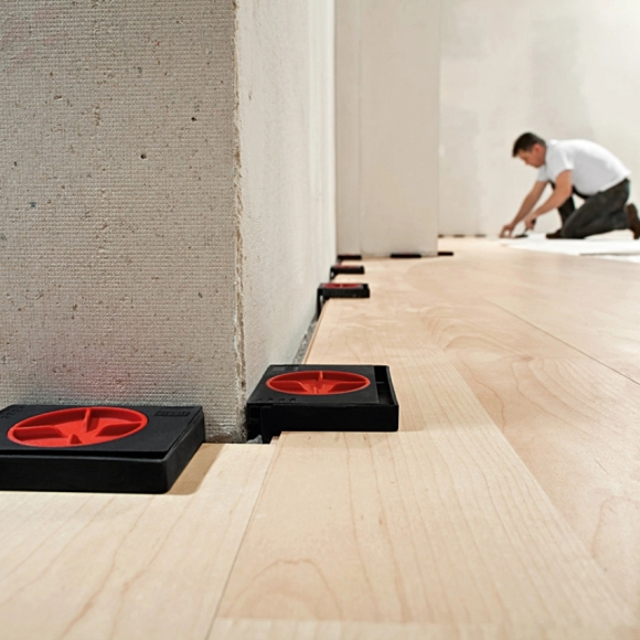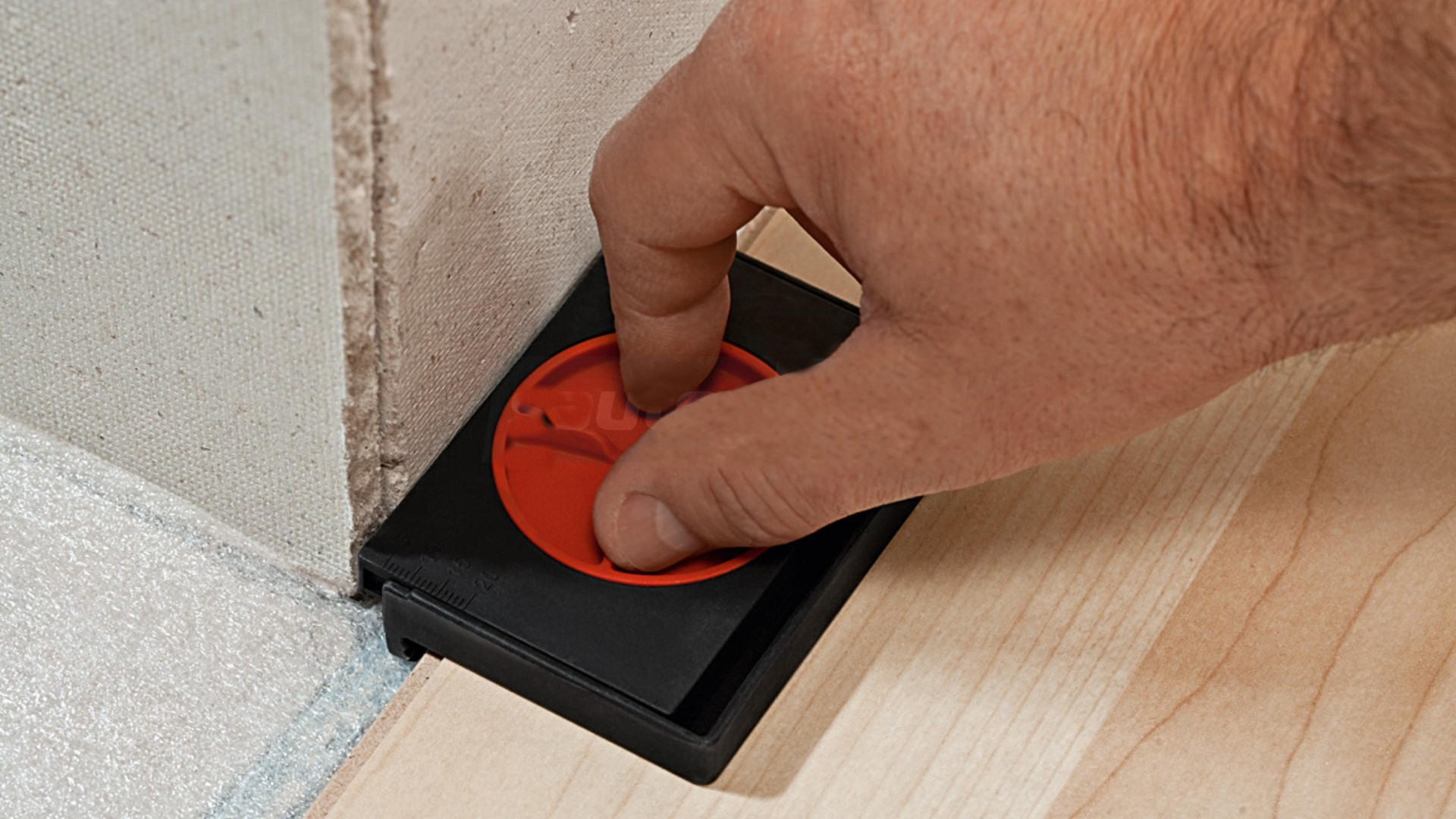 Fokozatmentesen állítható 5-20 mm-es faltávolságig · Távtartók úszó laminált és előregyártott parkettához · Széles érintkezési és támasztófelület, hogy elkerülje a nyomási pontokat a padlólapon és a vakolaton · Egyszerűen visszacsavarással könnyen eltávolítható · Nagyon könnyű és kompakt.