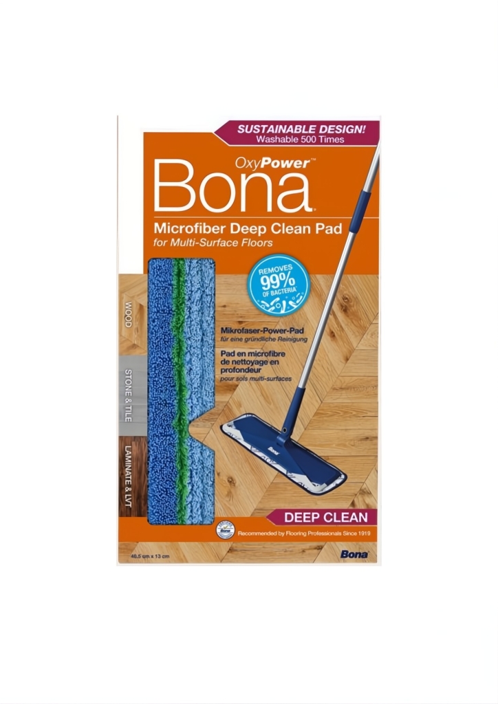 A Bona OxyPower Microfiber Deep Clean Pad egyedülálló, szabadalmaztatott PowerLoop® technológiát tartalmaz, amely finoman szétszedi és fellazítja a legmakacsabb szennyeződéseket. A kétzónás tisztító hatás sötétkék külső szálakat tartalmaz a szennyeződések feloszlatására, míg a világoskék belső szálak nagyobb nedvszívó képességgel fogják fel és szívják fel a szennyeződéseket, mint az előző betétünknél. Használja a Bona OxyPower mikroszálas mélytisztító betétet a Bona OxyPower fapadló mélytisztítóval és a Bona OxyPower kemény felületű mélytisztítóval a tökéletes tisztítási teljesítmény érdekében. Használja a Bona felmosócsaláddal fa és kemény felületű padlón egyaránt. A több mint 90%-ban újrahasznosított anyagból készült mikroszálas betét akár 500-szor is mosható és újrafelhasználható. A Bonánál elkötelezettek vagyunk a fenntartható megoldások előmozdítása mellett a tisztább és egészségesebb otthon érdekében.