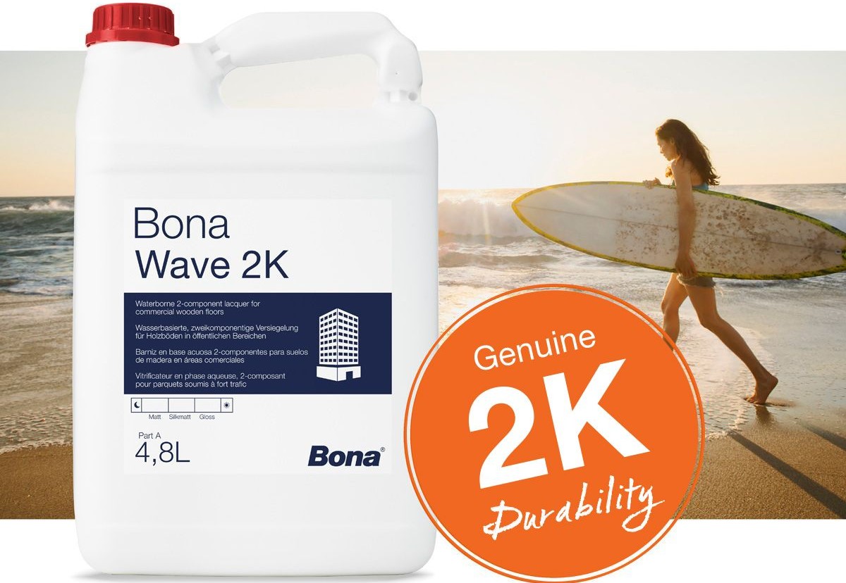 A Bona Wave 2K világszerte bevált teljesítményt nyújt nagy igénybevételű lakossági alkalmazásokban és alacsonyabb forgalmi intenzitású közterületeken, tartós tartósságot biztosít a fokozott vegyszer- és kopásállóságnak, valamint kivételesen alacsony, 4%-nál alacsonyabb VOC-tartalomnak és újrafestési időnek köszönhetően. mindössze 2-3 óra. A Wave 2K már elérhető több mint 30 forgalmazónál országszerte.