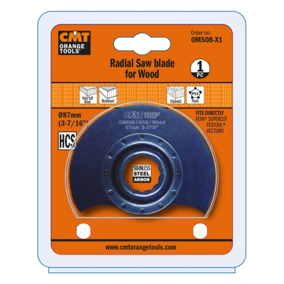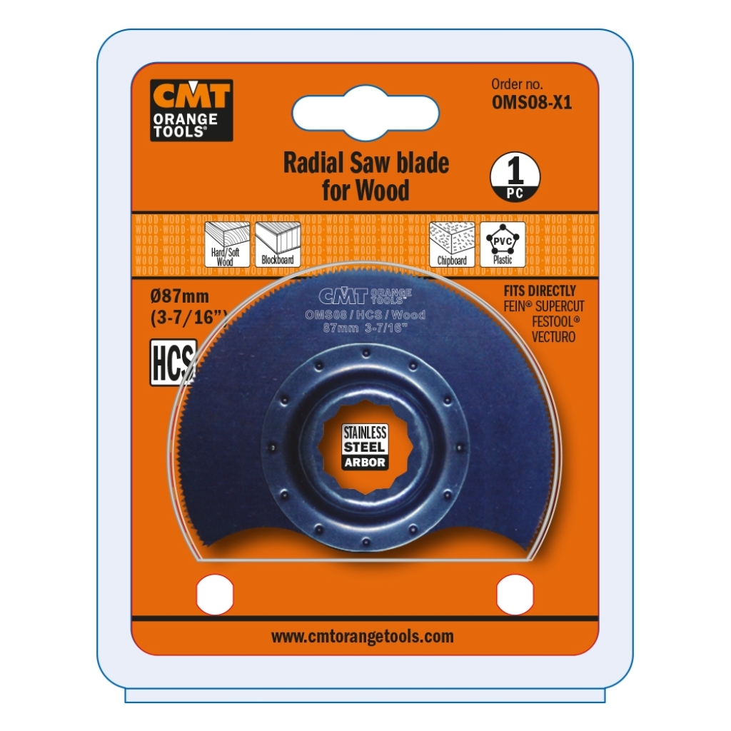 OMS sorozat CMT 87 mm-es radiális fűrész fához - 1 db-os| Az OMM sorozat Univerzális rögzítéssel a legtöbb géptípus számára alkalmas, míg az OMS sorozat a Fein® SuperCut és a Festool® Vecturo géptípusok számára alkalmas fa, falemez és forgácslap és műanyag csövek és profilok akár hosszanti vágásához. |