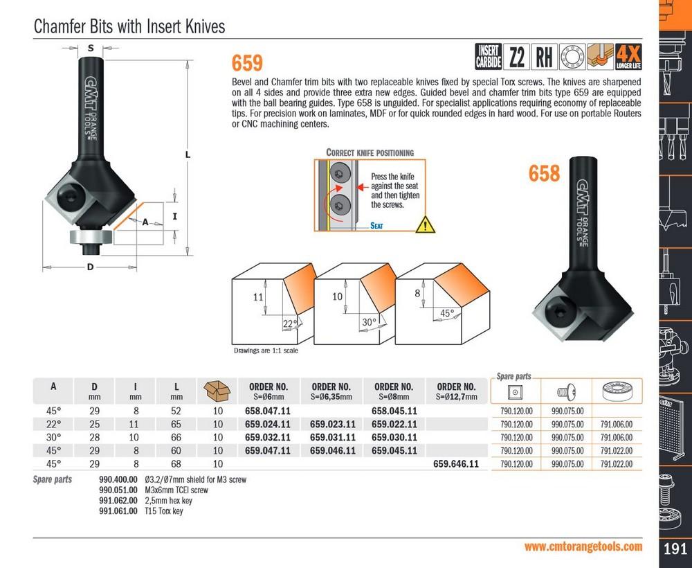 CMT cserelapkás szerszám élek leferdítéséhez, HW Z2 S=6 D=29X8X61 45° j.Kúpos és fózoló marófejek két cserélhető késsel, amelyeket speciális Torx csavarok rögzítenek. A kések mind a négy oldalon élesek, így három tartalék élt adnak.