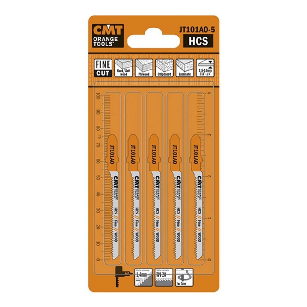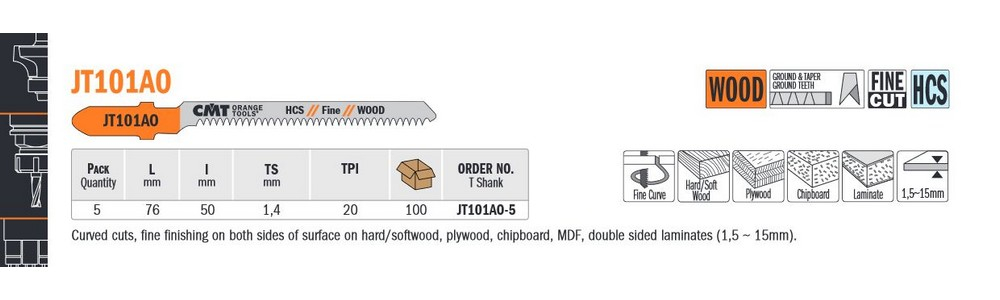 CMT ipari dekopír fűrészlap íves vágásokhoz, puha és keményfára. Finom kivitelű felület mindkét oldalon. Rétegelt lemez, forgácslap, mdf, kétoldalas laminálthoz. 1,5mm-től 15mm-ig