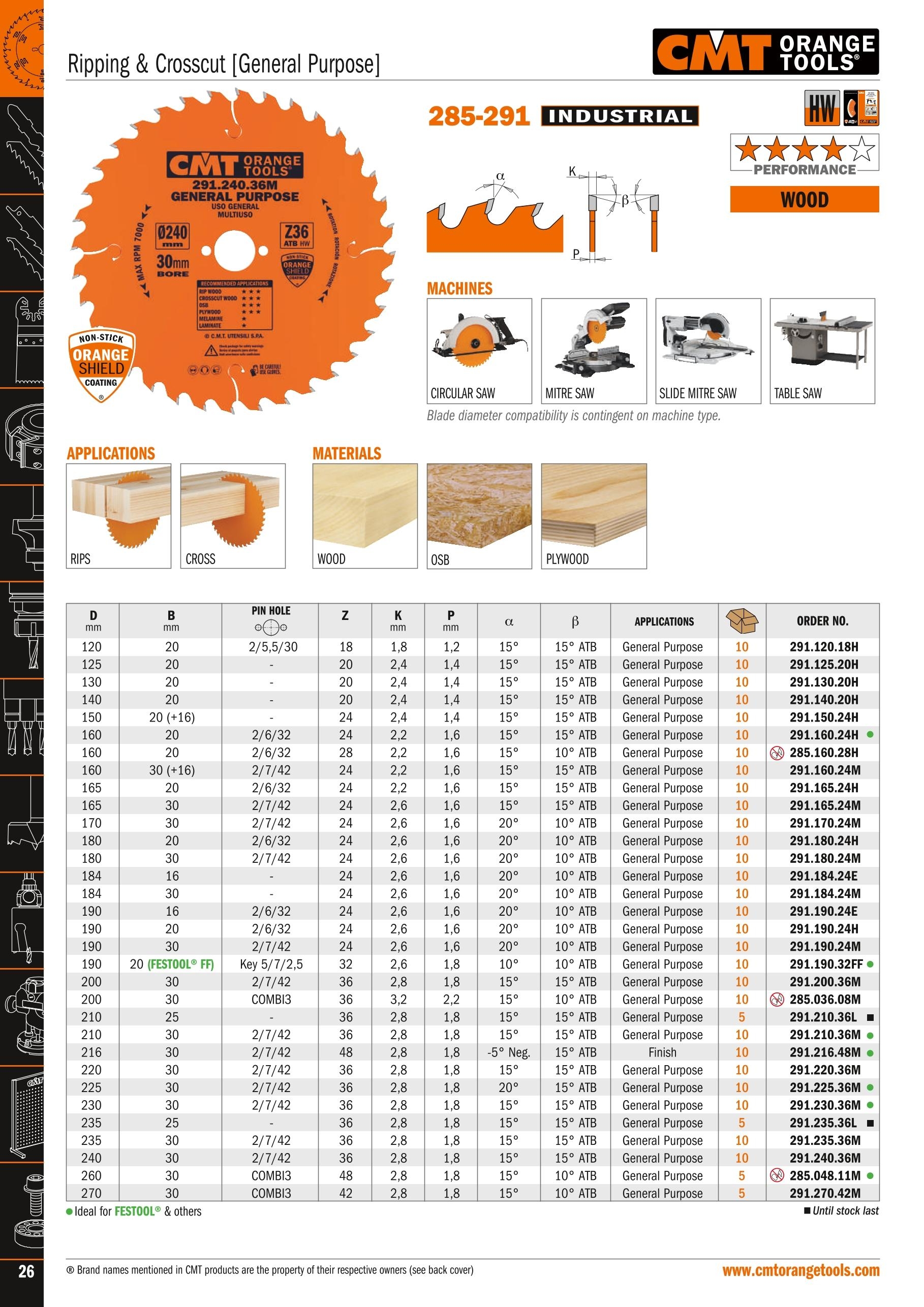 Optimális magas minőségű keresztvágáshoz, asztali és hordozható gépekhez. Puha és keményfa vágásához, egzotikus fához, fa alapú panelek vágásához. Egy oldalon furnérozott lapokhoz, papír fóliás bútorlaphoz, thermoplasztik anyagok és rétegelt lemezek vágásához.