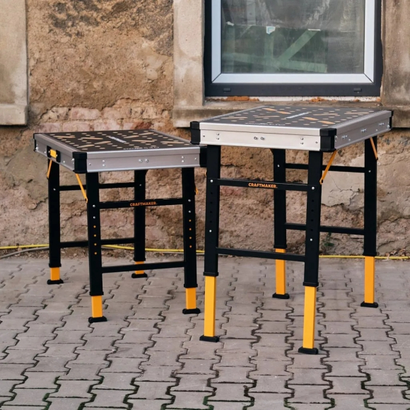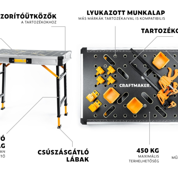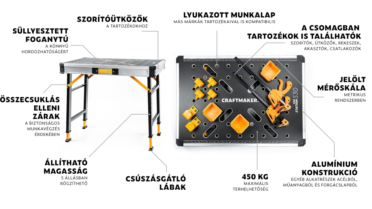 A CRAFTMAKER Pro Station S30 multifunkciós összecsukható munkaasztal könnyedén hordozható munkafelületet biztosít. Masszív munkalapja okosan lyukazott az ütközők és bilincsek számára. Stabil, állítható magasságú lábai keresztrúddal ellátottak anyagtároláshoz. Robusztus felépítés és tárolórekeszek. Gumiból készült fogantyú a könnyű hordozhatóság érdekében. Maximális teherbírása 450 kg. Tartozékok a csomag részeként.