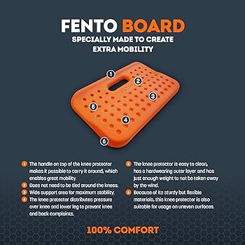 A FENTO BOARD a legújabb ergonomikus térdvédőnk. Ezt a terméket kifejezetten az extra mobilitásra tervezték: ezt a térdvédőt nem kell a térdére kötni, a tetején található fogantyú pedig lehetővé teszi a könnyű mozgatását.