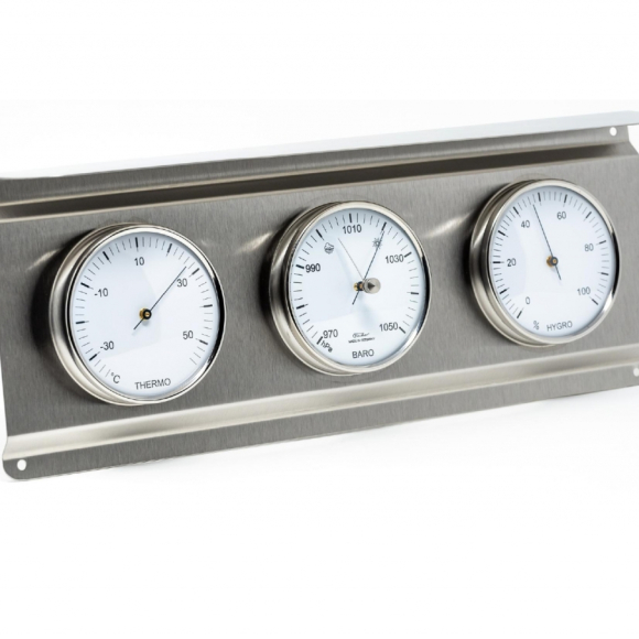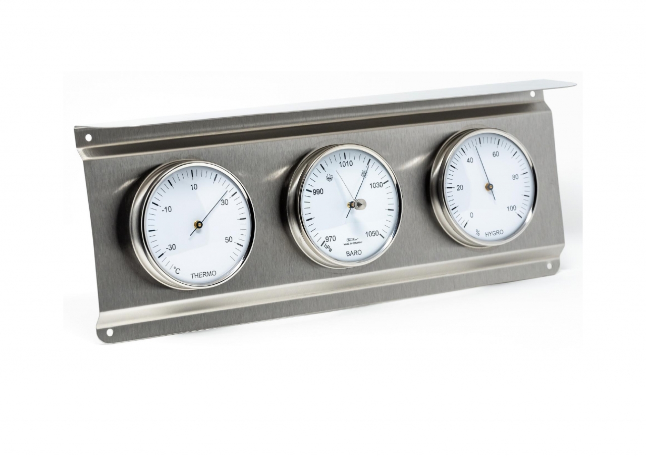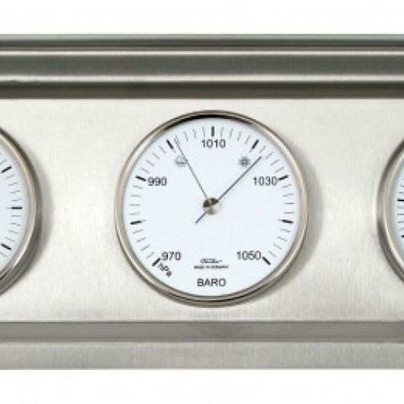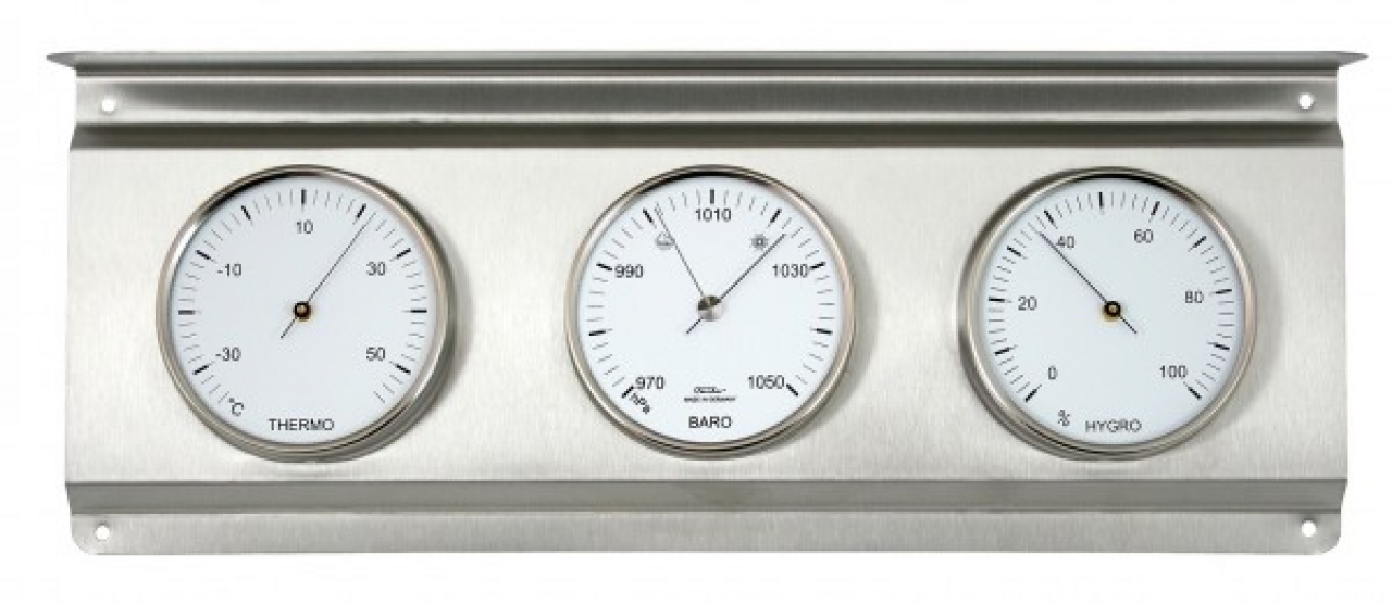 Időjárás állomás rozsdamentes acélból hőmérővel, barométerrel és higrométerrel.