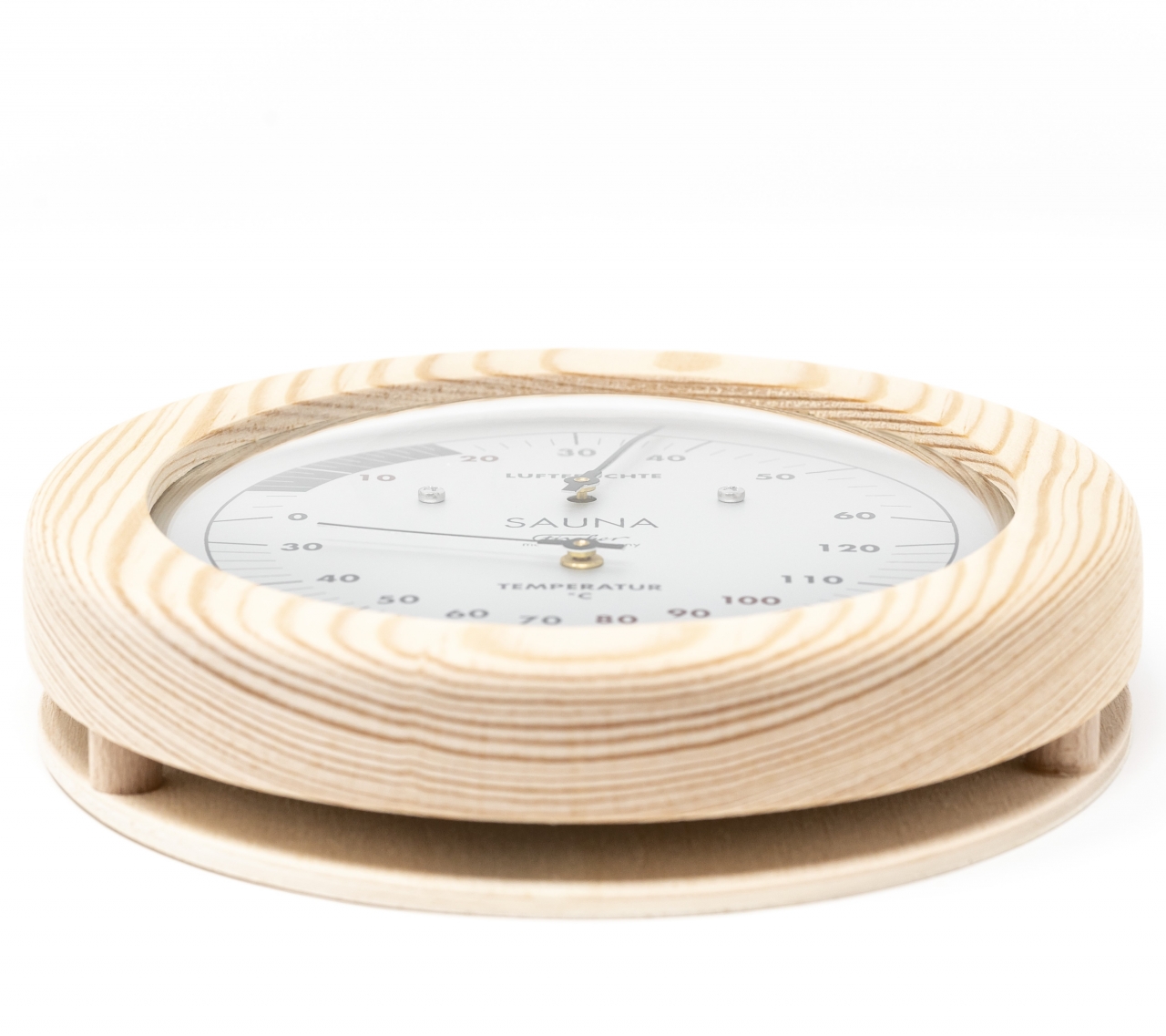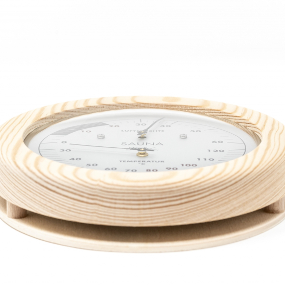 Szintetikus hajhigrométer bimetál hőmérővel kombinálva a páratartalom és a hőmérséklet mérésére szaunában.