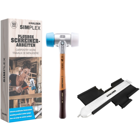 A PLUSBOX ASZTALOS MUNKA tartalmazza a HALDER „ácskalapácsát” és extraként egy kontúrmérőt: