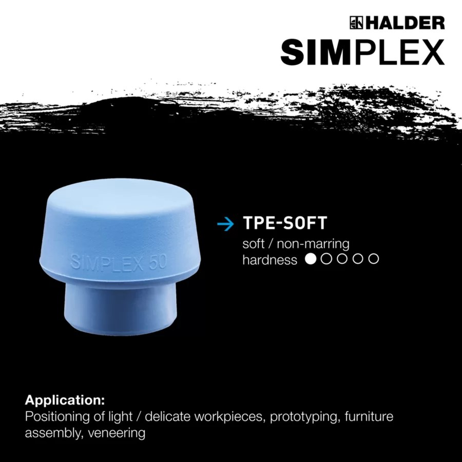 A SIMPLEX ütőbetét TPE-soft (3201-es sorozat) egy hőre lágyuló elasztomer, és kb. 65 Shore A keménységgel a SIMPLEX sorozat legpuhább lapkája. Ez a kék ütőbetét erősen csillapító, ezért ideális az érzékeny munkákhoz. A hagyományos gumikalapácsokhoz képest nem hagy maga után nem kívánt fekete kopást. Ez a betét D30mm-től D80mm-ig kapható.