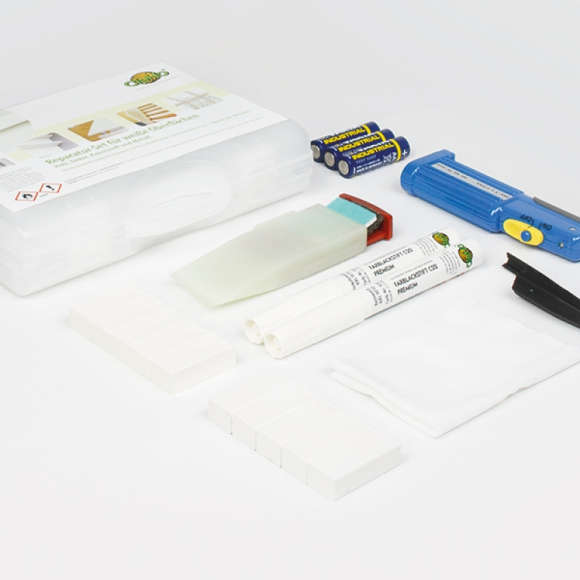Javítókészlet töltőanyagokkal, retusáló lakkkal és minden szükséges eszközzel - különösen fehér dekor- és műanyag felületekhez. Gyors retusáláshoz és javításhoz. A töltőanyagok és a javító tollak két általános RAL fehér tónusban találhatók. Kisebb szervizdobozként összeszereléshez és szállításhoz vagy helyszíni javítási/retusálási munkákhoz vagy megfelelő segítőként a háztartásban.