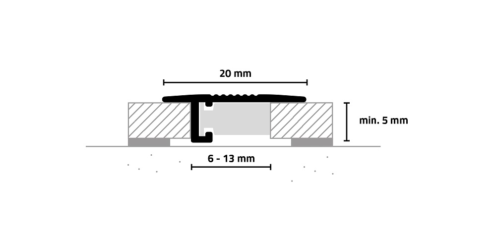 Az UL20X5 burkolatváltó profil diszkrét és innovatív átmenetet hoz létre az azonos vastagságú padlók között, és bárhol, ahol csatlakozásokat és dilatációs hézagokat ki kell alakítani a beton szerkezetek hőtágulása miatt.