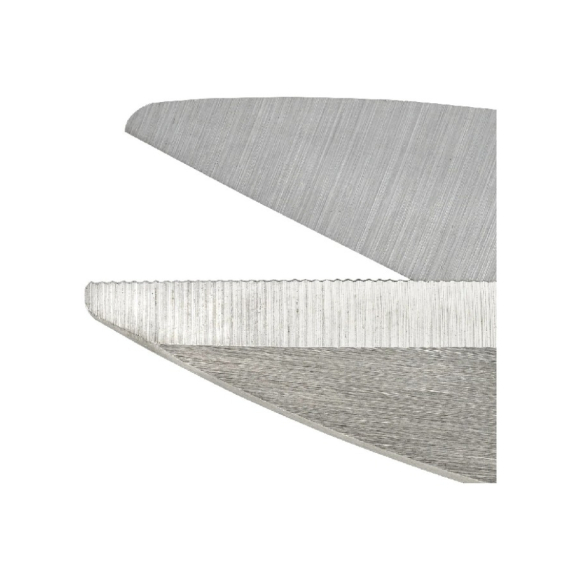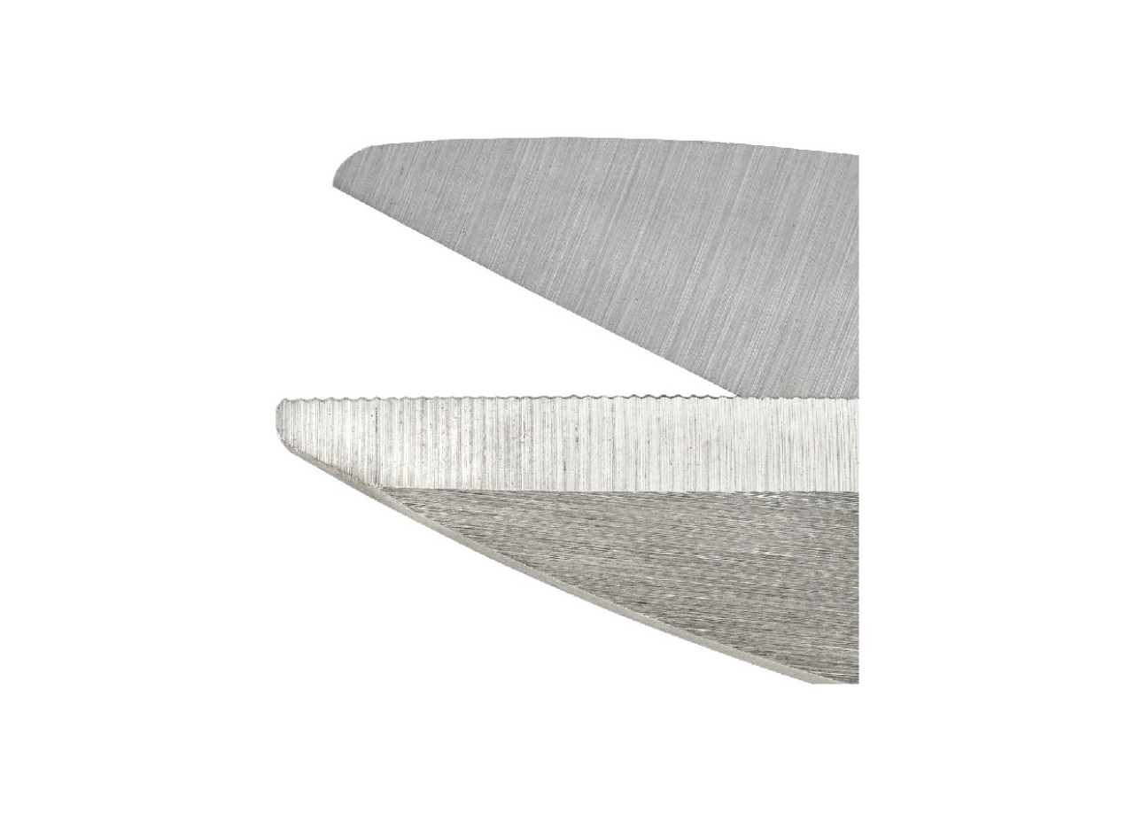 Szakértőileg élesített az aljától a hegyéig, hogy tiszta vágást biztosítson a penge teljes hosszában. Az egyik recés élű pengével tervezett olló megfogja a vágandó anyagot, megakadályozva a megcsúszást vagy a vágási hibákat. Ipari erősségű rozsdamentes acél szegecssel rögzítve ez az olló könnyedén megbirkózik üvegszállal, alumíniummal, linóleummal, Kevlar®-ral és sok más anyaggal anélkül, hogy veszítene az erejéből. A félig tompa hegyű hegy növeli a felhasználó biztonságát.