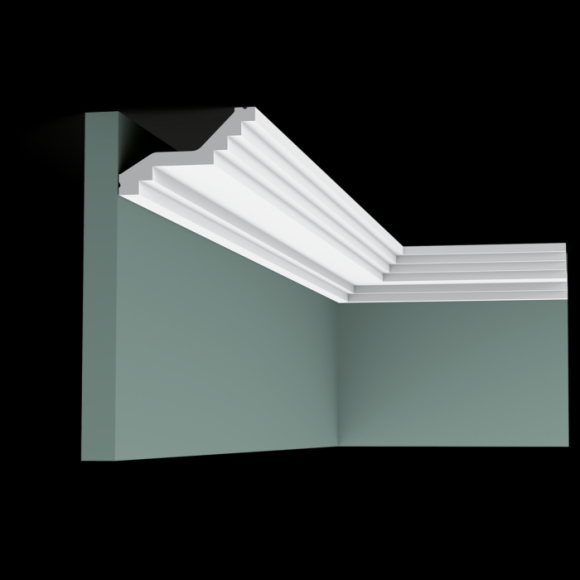 Mennyezeti díszléc Art Deco stílusban. Gyönyörűen nyúlik végig a mennyezeten, és elegáns átmenetet hoz létre a falon.