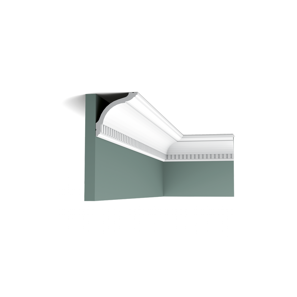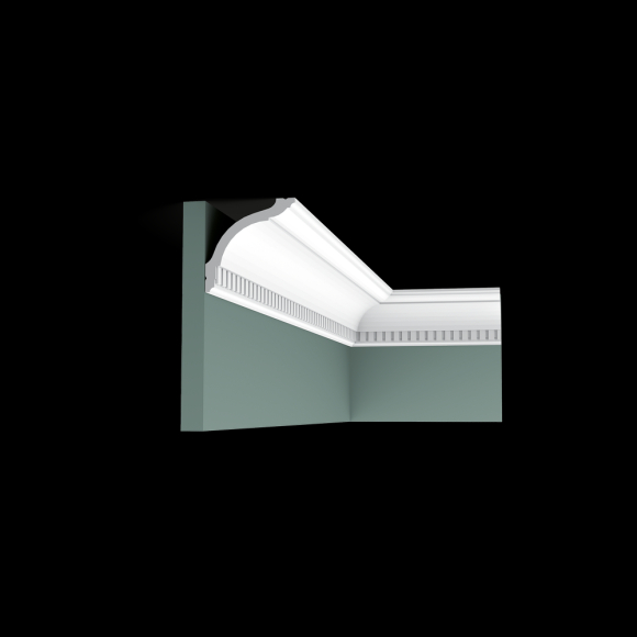 Ez az elegáns, csipkézett karnis díszléc letisztult átmenetet hoz létre a fal és a mennyezet között.