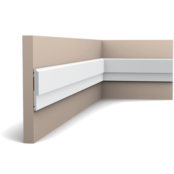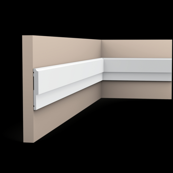 Ez a lépcsős profil nagyszerű módja annak, hogy mélységet biztosítson a lapos karnislécekhez. Falra és mennyezetre egyaránt alkalmas.