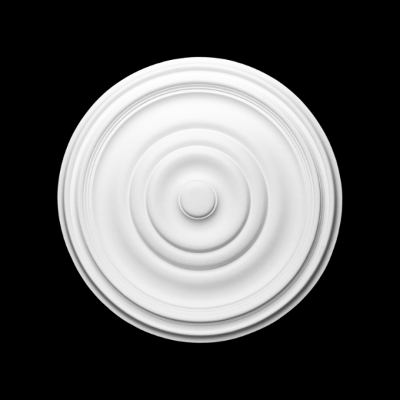 Közepes méretű központi mennyezetdísz koncentrikus körökkel. Ez az egyszerű kialakítás bármilyen stílushoz illeszkedik. Hely a kábelek elrejtésére.