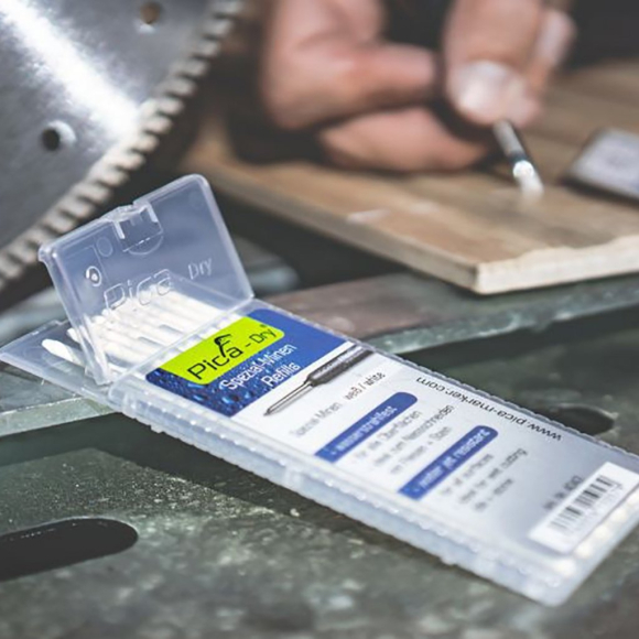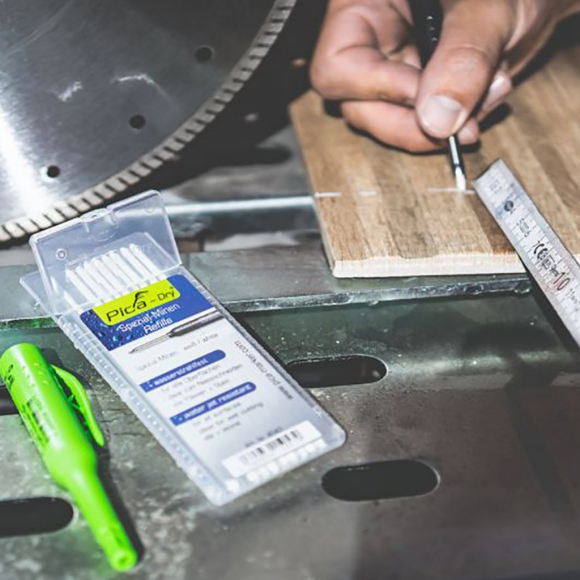 Vízálló fehér pótbetét a Pica Dry asztalos ceruzához, ami minden nedves felületre alkalmas. Kloridmentes. 40 °C-ig hőálló.