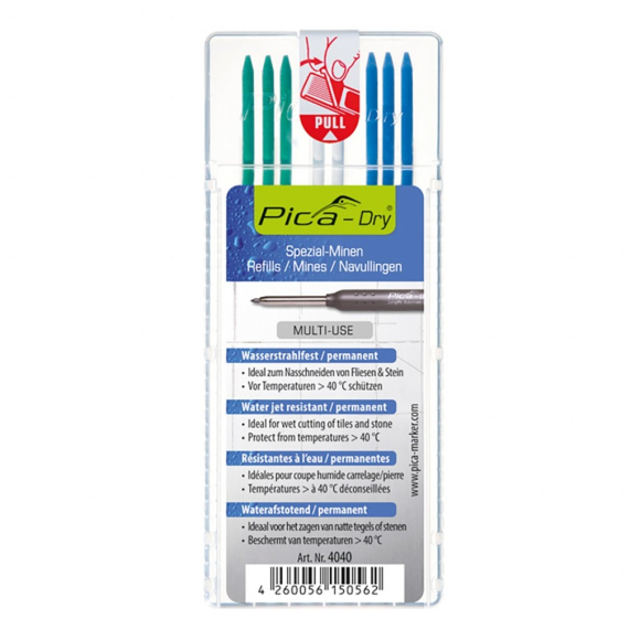 Vízálló pótbetét a Pica Dry asztalos ceruzához, ami minden nedves felületre alkalmas. Kloridmentes. 40 °C-ig hőálló.