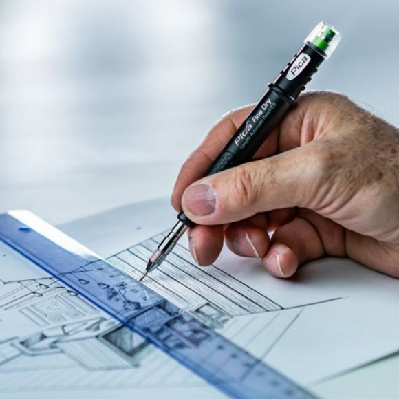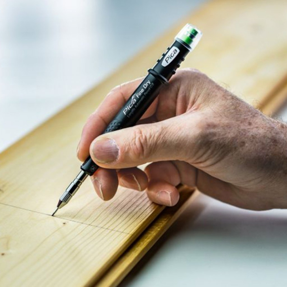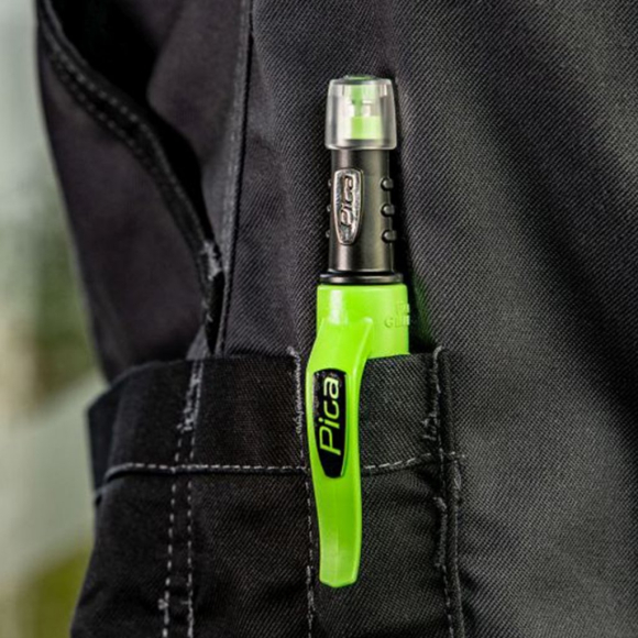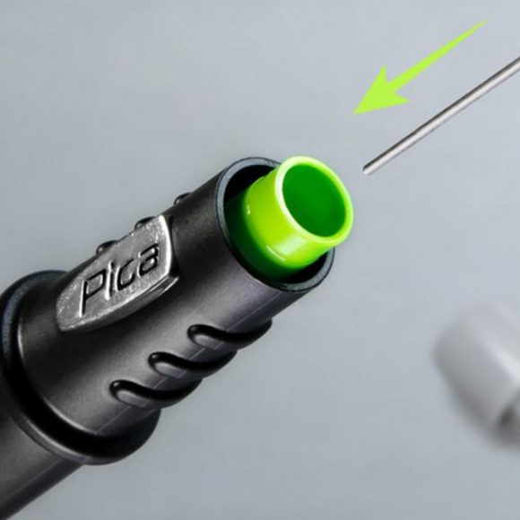 Mechanikus ceruza az igazán precíz jelölésekhez a német PICA cégtől. A bél átmérője csupán 0,9 mm. Szinte minden típusú felületre fog. Cserélhető betétek. Beépített radír a jelölések javításához. A ceruza adagológombjának kialakításából eredően nem kerül por vagy víz a ceruza belsejébe. Az akasztós kupak tokként is szolgál.