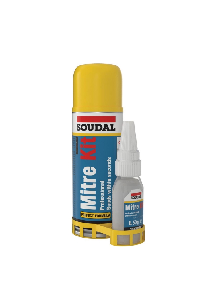 A Mitre Kit két termékből álló készlet, tartalmaz egy magas viszkozitású cianoakrilát ragasztót és egy aktivátor aeroszolt.