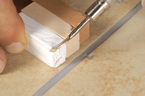 A gázfűtéses vasaló forró hegyével vigye fel a megfelelő színű kerámia töltőanyagot a sérült területre. Mindig a világostól a sötétig haladva dolgozzon. A különböző színek össze is keverhetők a pontos árnyalat eléréséhez. Minden olvasztási folyamat után tisztítsa meg az olvasztófej hegyét.